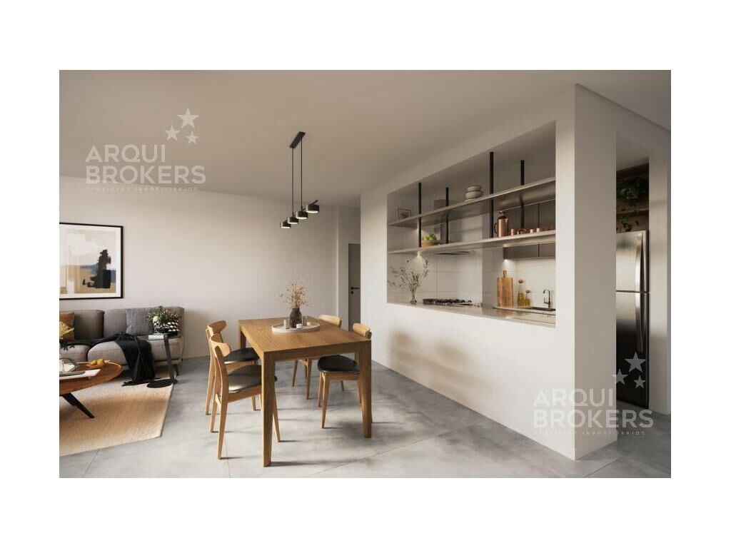Living comedor con terraza al frente, cocina integrada con placares y barra, 1 dormitorio con placard, 1 baño completo.