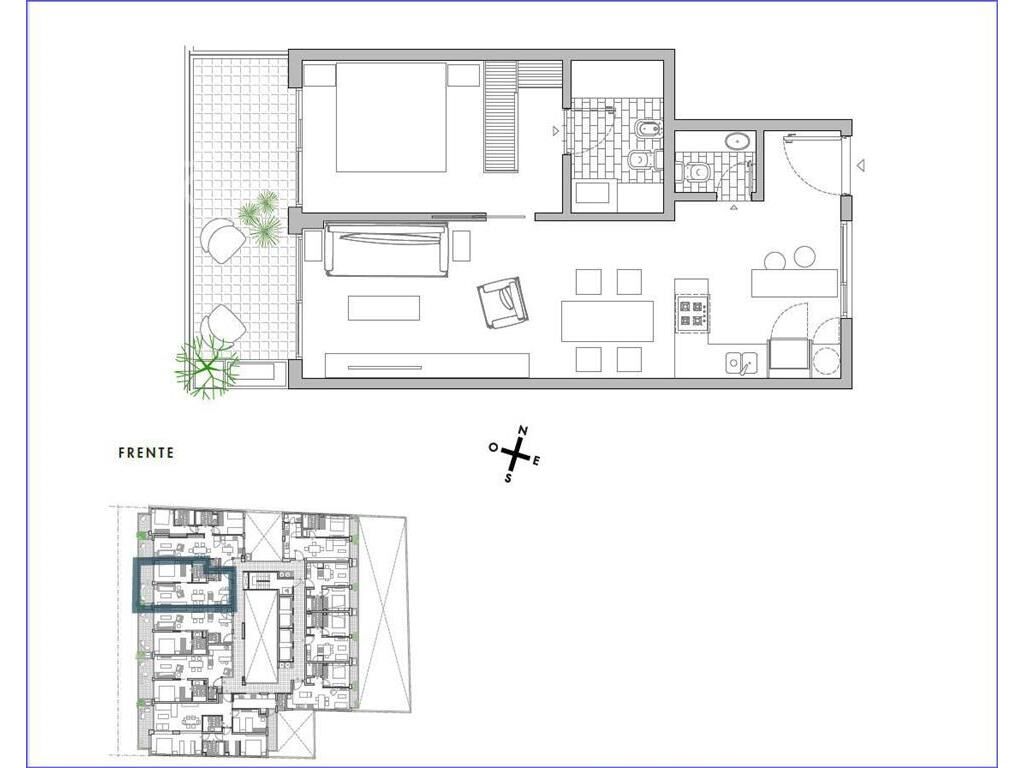 Living comedor con terraza al frente, cocina integrada con placares, con bacha de acero inoxidable y mesadas de Silestone, horno anafe y campana de extracción. 1 dormitorio en suite con vestidor, 1 baño completo y 1 baño social.