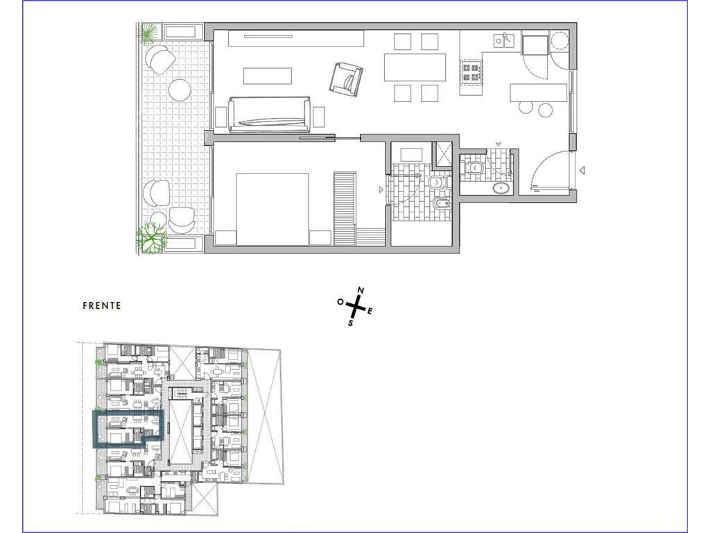 Living comedor con terraza al frente, cocina integrada con placares, con bacha de acero inoxidable y mesadas de Silestone, horno anafe y campana de extracción. 1 dormitorio en suite con vestidor, 1 baño completo y 1 baño social.