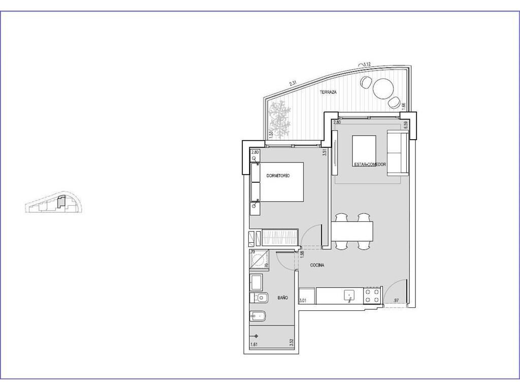 Living comedor con terraza al frente, cocina integrada con placares y conexión para lavarropas y campana. 1 dormitorio al frente con terraza y placard, 1 baño completo.