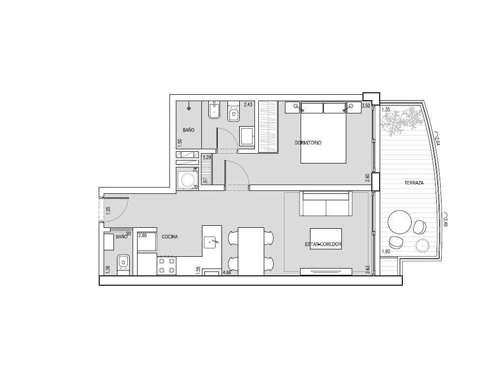 Living comedor con terraza al frente, cocina integrada con placares y conexión para lavarropas y campana. 1 dormitorio con terraza y placard,