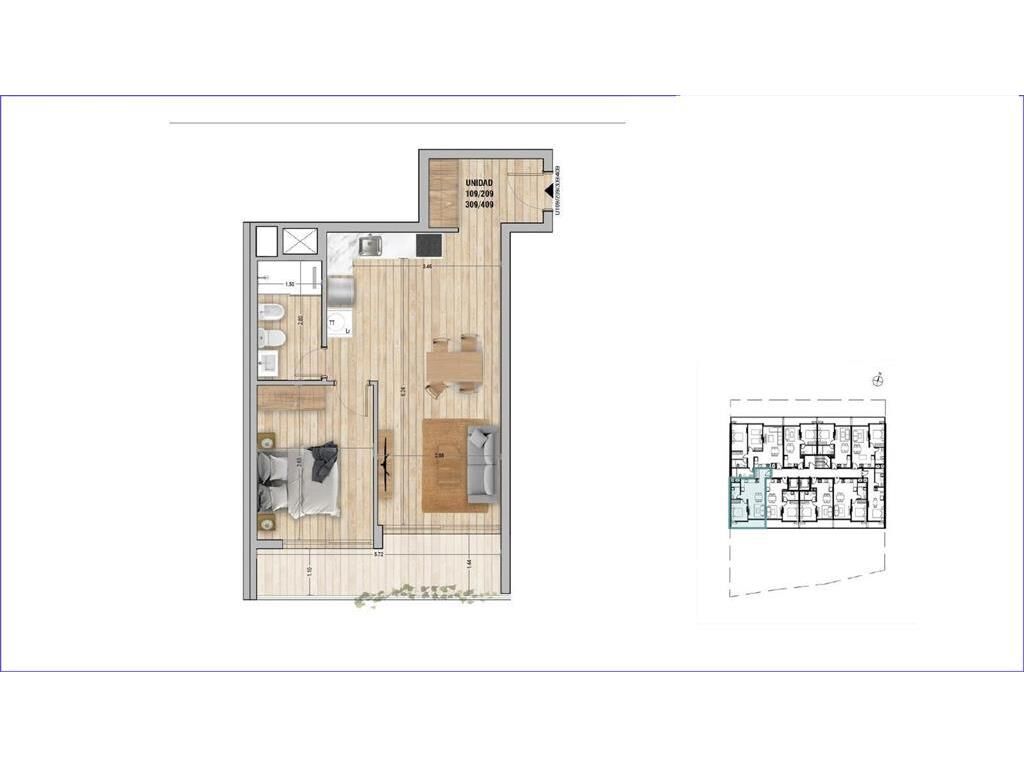 Living comedor con terraza, cocina integrada con placares, campana, anafe y termotanque, 1 dormitorio con placard y cortina de enrollar, 1 baño completo con placard.