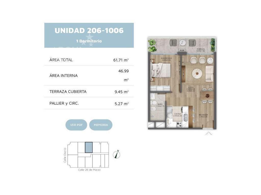 Living comedor con terraza, cocina integrada con placares y campana, horno y anafe, 1 dormitorio con placard y 1 baño completo.