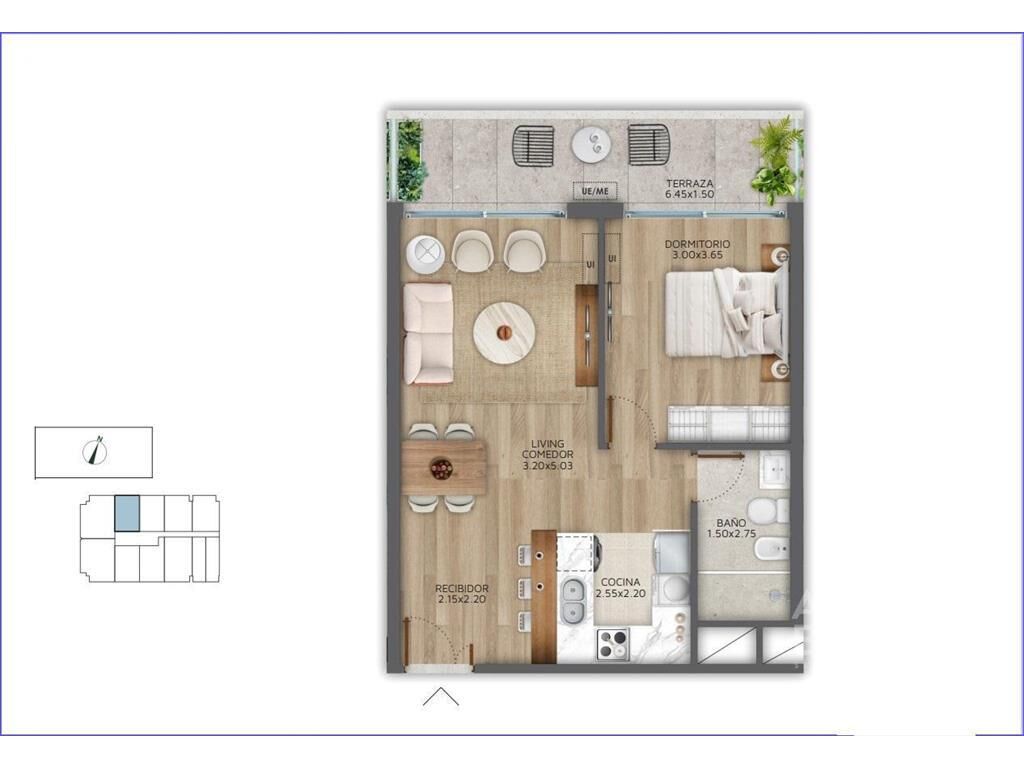 Living comedor con terraza, cocina integrada con placares y campana, horno y anafe, 1 dormitorio con placard y 1 baño completo.