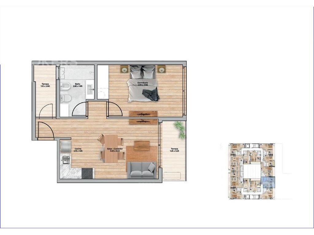 Living comedor con terraza, cocina integrada con placares, anafe, campana y termotanque, 1 dormitorio con placard, 1 baño completo.