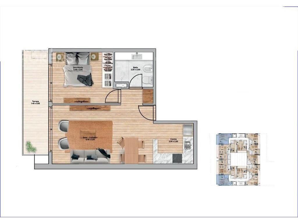 Living comedor con terraza al frente, cocina integrada con placares, anafe, campana y termotanque, 1 dormitorio con placard, 1 baño completo.