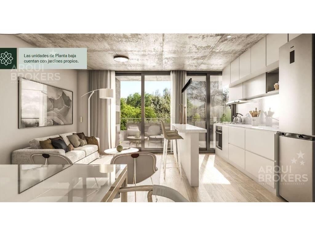 Living comedor con terraza con parrillero, cocina integrada con placares, 1 dormitorio, 1 baño.