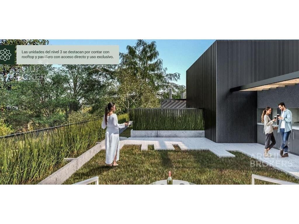 El edificio cuenta con rooftop con parrilleros, garajes, barbacoa, gimnasio, piscina de 17x4 m y espacios de cowork.