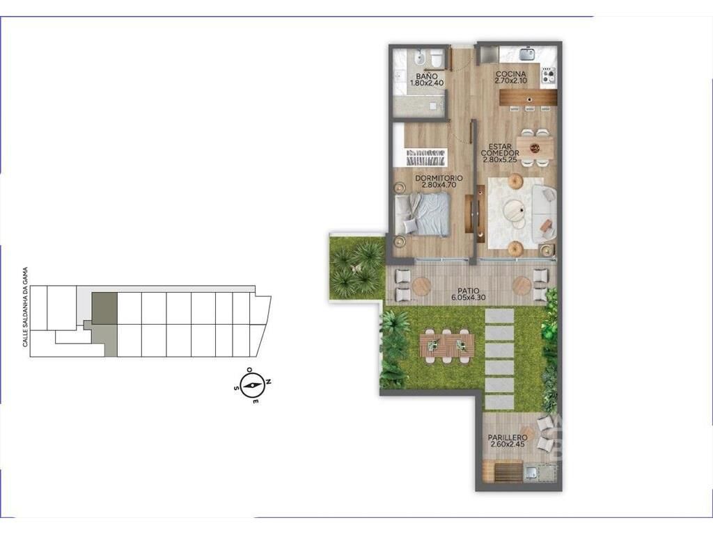 Living comedor con cocina integrada con placares y extractor, 1 dormitorio con placard, 1 baño completo. Patio de 43 m2 con parrillero al cual se accede desde living y dormitorio.