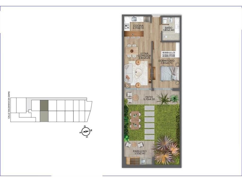 Living comedor con cocina integrada con placares y extractor, 1 dormitorio con placard, 1 baño completo. Patio de 45 m2 con parrillero al cual se accede desde living y dormitorio.