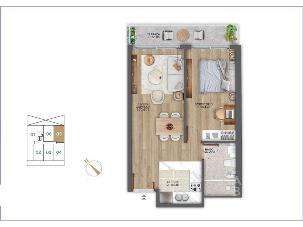Living comedor con terraza, cocina integrada con placares, campana, horno y anafe, 1 dormitorio con placard y cortina de enrollar de aluminio, 1 baño.