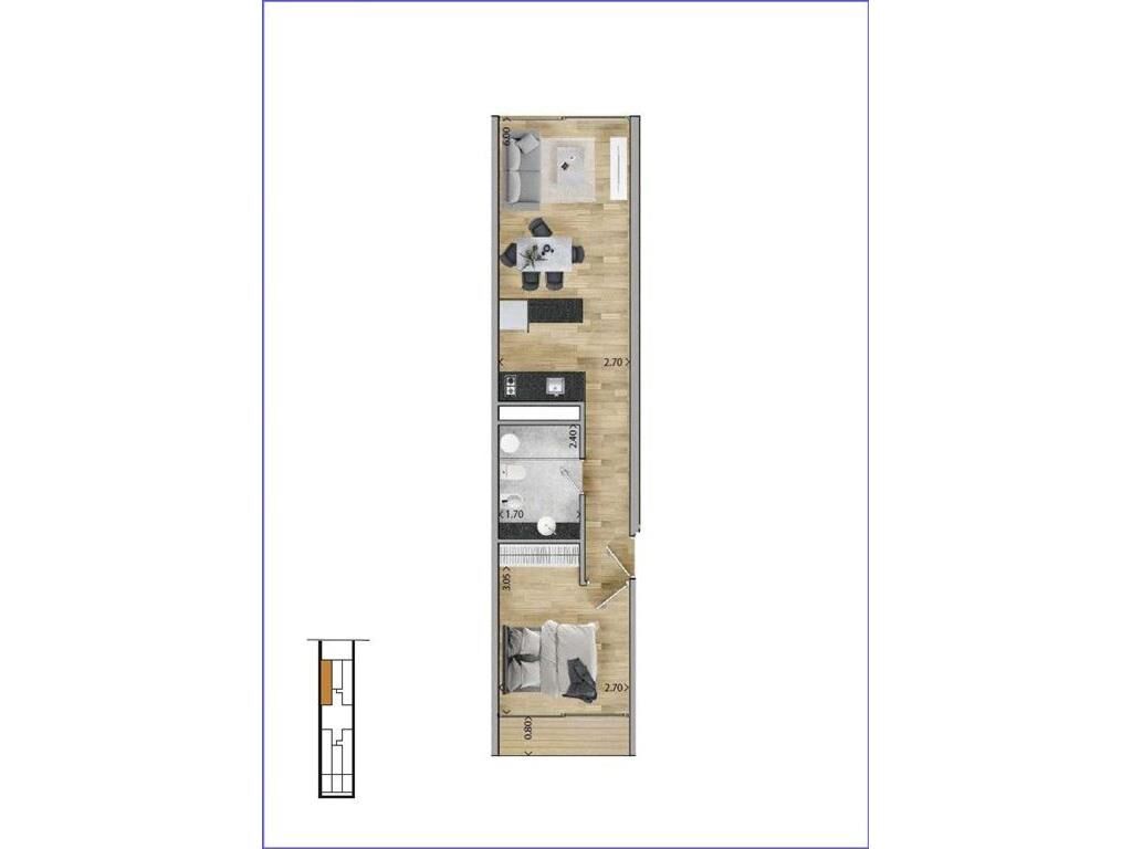 Living comedor con cocina integrada con placares, anafe vitrocerámico, horno eléctrico, extractor y termotanque, 1 dormitorio con placard y terraza, 1 baño completo con extractor.
