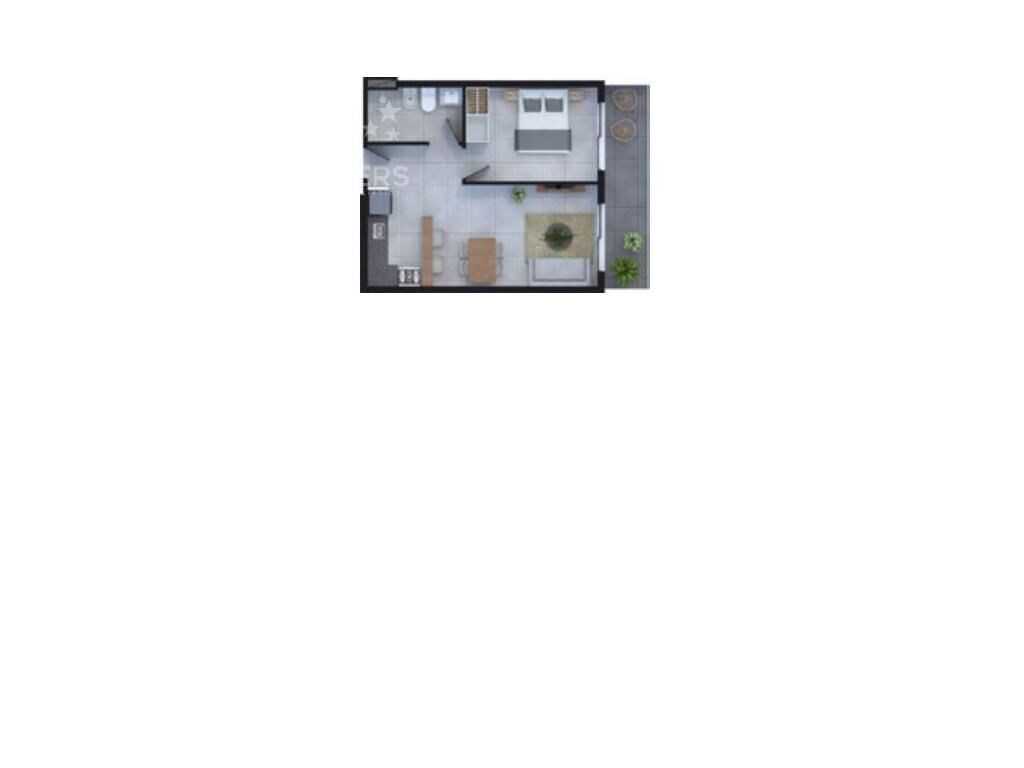 Living comedor con terraza, cocina integrada con barra y placares bajo mesada y aéreo, 1 dormitorio con placard, 1 baño completo.