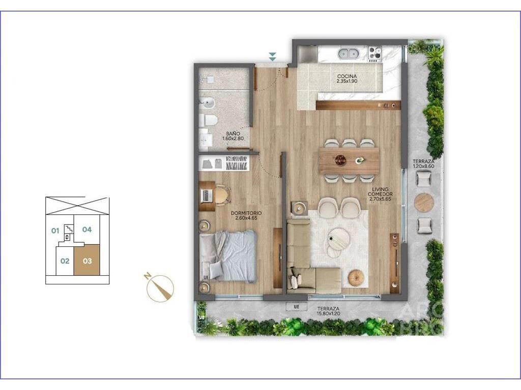 Living comedor con terraza en esquina de 20 m2, cocina integrada con placares, campana, horno y anafe, 1 dormitorio con placard y cortina de enrollar de aluminio, 1 baño.