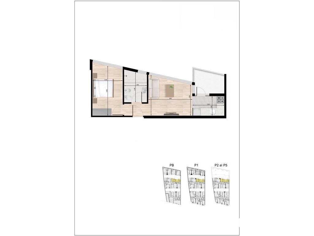 Living comedor con terraza, cocina integrada con placares, 1 dormitorio y 1 baño.
