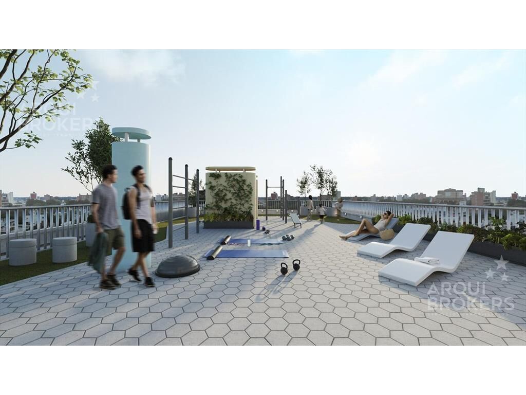 Rooftop con amenidades: open gym, solárium y duchas, barbacoa, juegos para niños y materas.