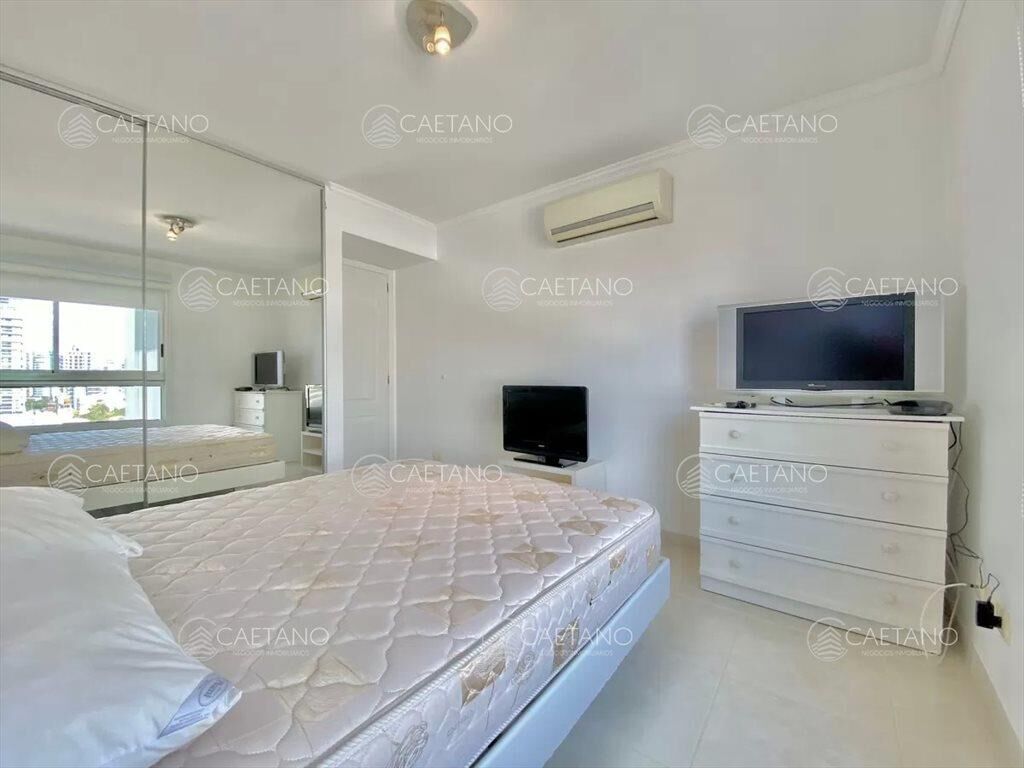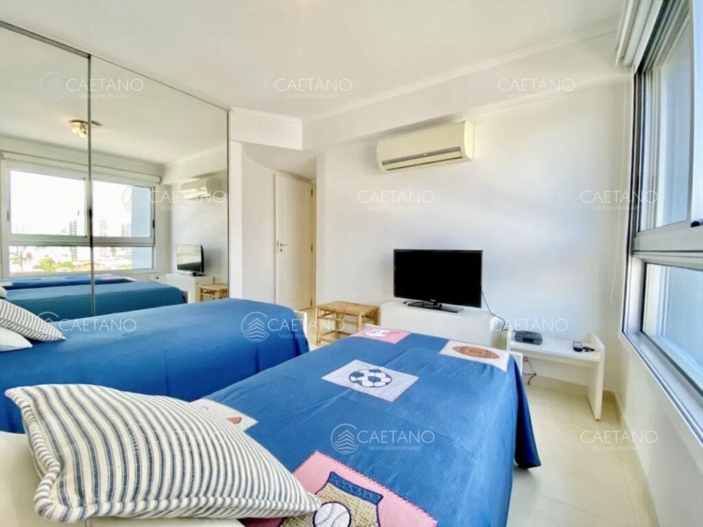 Apartamento amplio y luminoso, a cuadra y media de Playa Mansa y 3 de Playa Brava, La unidad cuenta con un gran LivingComedor con toillete y una bella vista a la playa y Punta del Este, con salidad a la terraza con parilla que cuenta con cerramiento de vidrio para tener la opción de disfrutar del aire fresco o protegerse del viento., Cocina con comedor diario, dependencia de servicio con baño y lavadero. El apartamento posee tres habitaciones, una con cama doble y otra con dos individuales, un baño completo y la habitación principal con baño en suite y vestidor.
