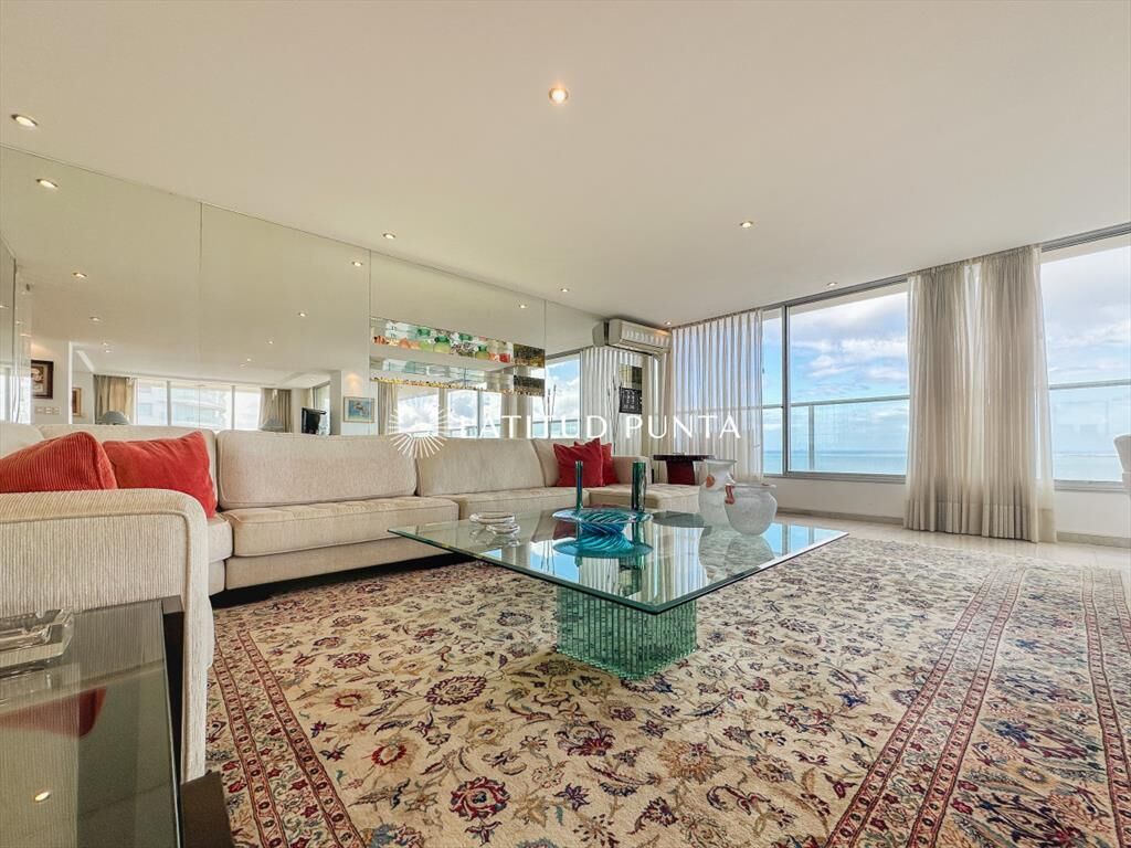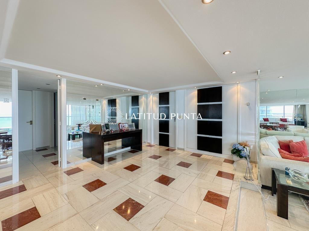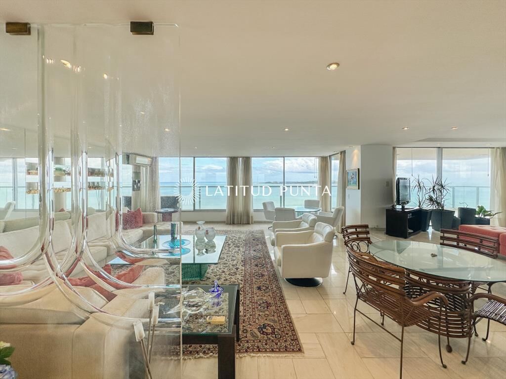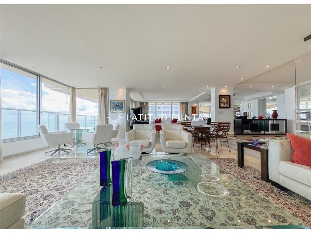 Exclusivo semi-piso en Golden Gate, emblemático edificio en la parada 7 de Punta del Este, primera línea, playa Mansa. Gran ambiente principal sectorizado en doble living, comedor y bar. Terraza esquinera. Cocina definida con comedor diario, lavadero, dependencia completa e ingreso de servicio. Hall con toilette de recepción. 3 dormitorios en suite (3 baños completos), principal con amplio vestidor. Garage en subsuelo para dos vehículos. Edificio de excelente construcción con recepción 24hs, servicio de mucamas, servicio de playa, servicio de lavado de autos, piscina exterior, sala de masajes, salón de usos múltiples, sauna con zona relax, gimnasio, playroom y playground.
