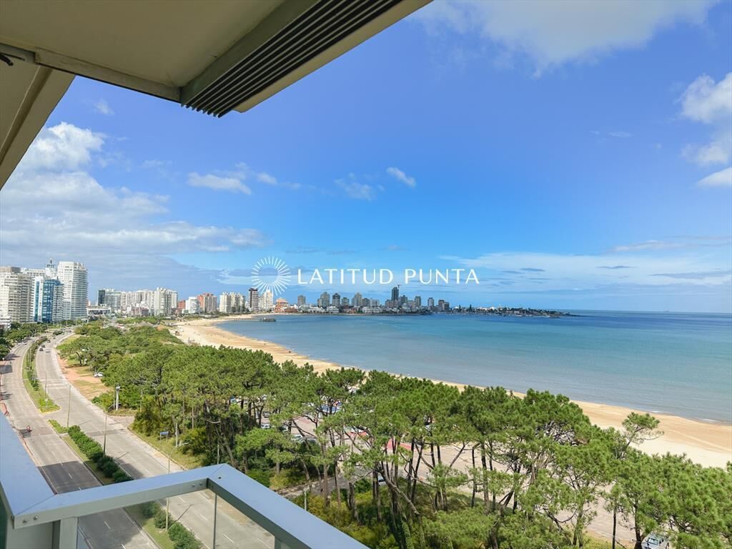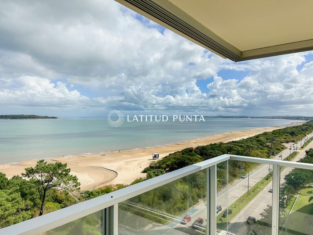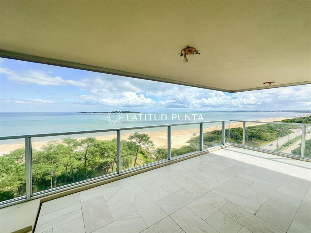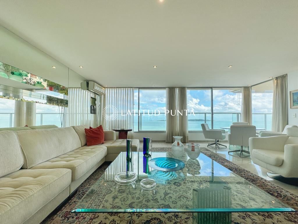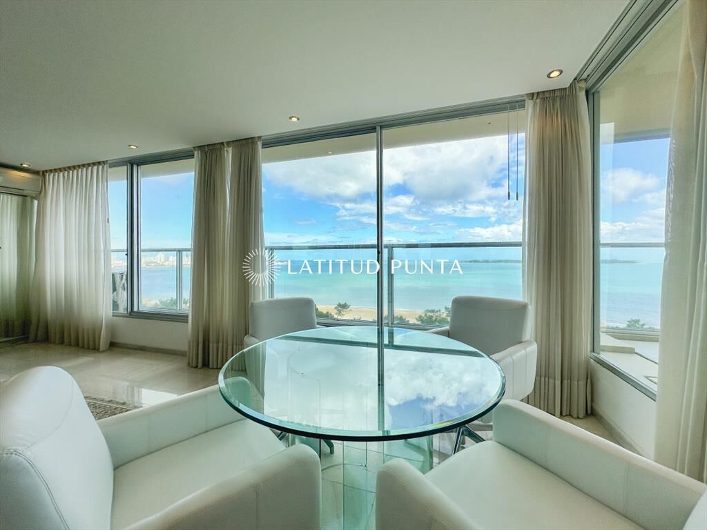 Exclusivo semi-piso en Golden Gate, emblemático edificio en la parada 7 de Punta del Este, primera línea, playa Mansa. Gran ambiente principal sectorizado en doble living, comedor y bar. Terraza esquinera. Cocina definida con comedor diario, lavadero, dependencia completa e ingreso de servicio. Hall con toilette de recepción. 3 dormitorios en suite (3 baños completos), principal con amplio vestidor. Garage en subsuelo para dos vehículos. Edificio de excelente construcción con recepción 24hs, servicio de mucamas, servicio de playa, servicio de lavado de autos, piscina exterior, sala de masajes, salón de usos múltiples, sauna con zona relax, gimnasio, playroom y playground.