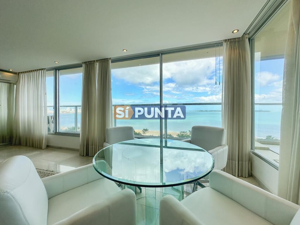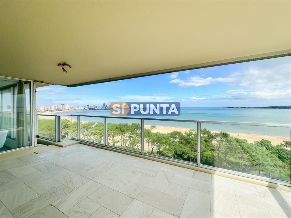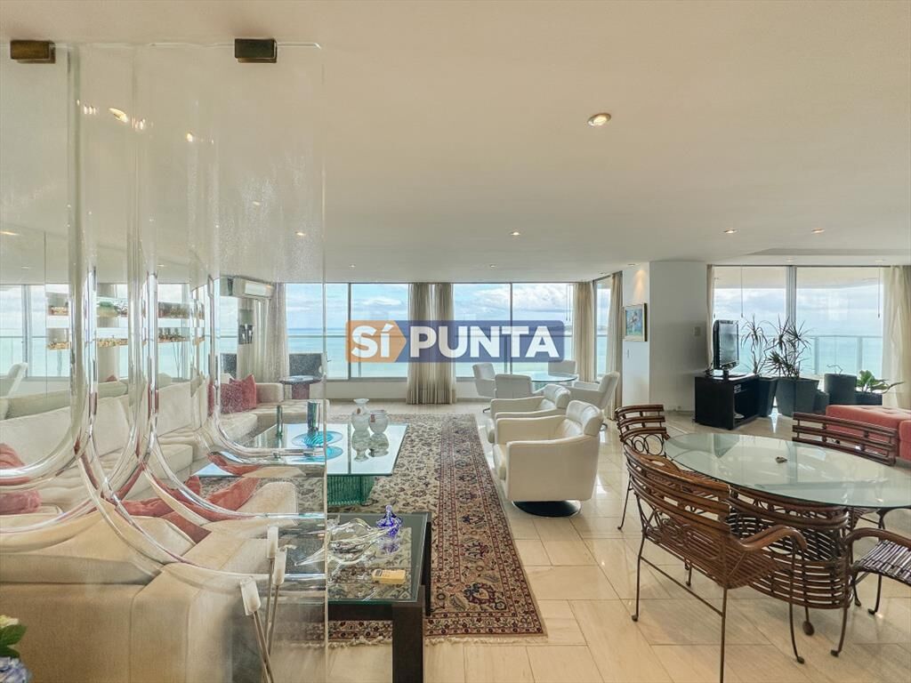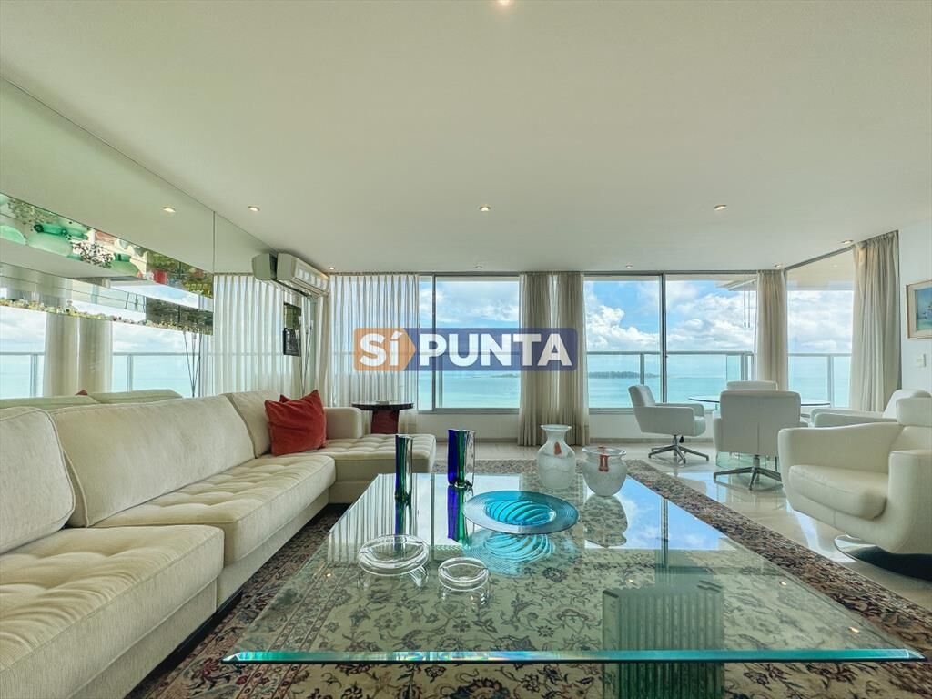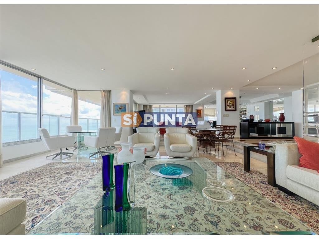 Exclusivo semi-piso en Golden Gate, emblemático edificio en la parada 7 de Punta del Este, primera línea, playa Mansa. Gran ambiente principal sectorizado en doble living, comedor y bar. Terraza esquinera. Cocina definida con comedor diario, lavadero, dependencia completa e ingreso de servicio. Hall con toilette de recepción. 3 dormitorios en suite (3 baños completos), principal con amplio vestidor. Garage en subsuelo para dos vehículos. Edificio de excelente construcción con recepción 24hs, servicio de mucamas, servicio de playa, servicio de lavado de autos, piscina exterior, sala de masajes, salón de usos múltiples, sauna con zona relax, gimnasio, playroom y playground.