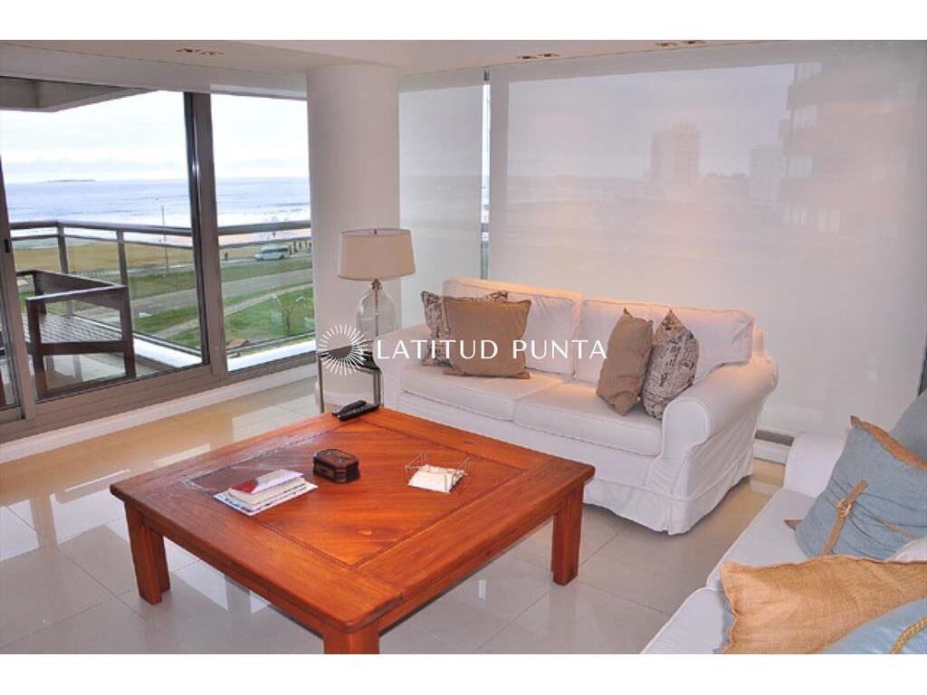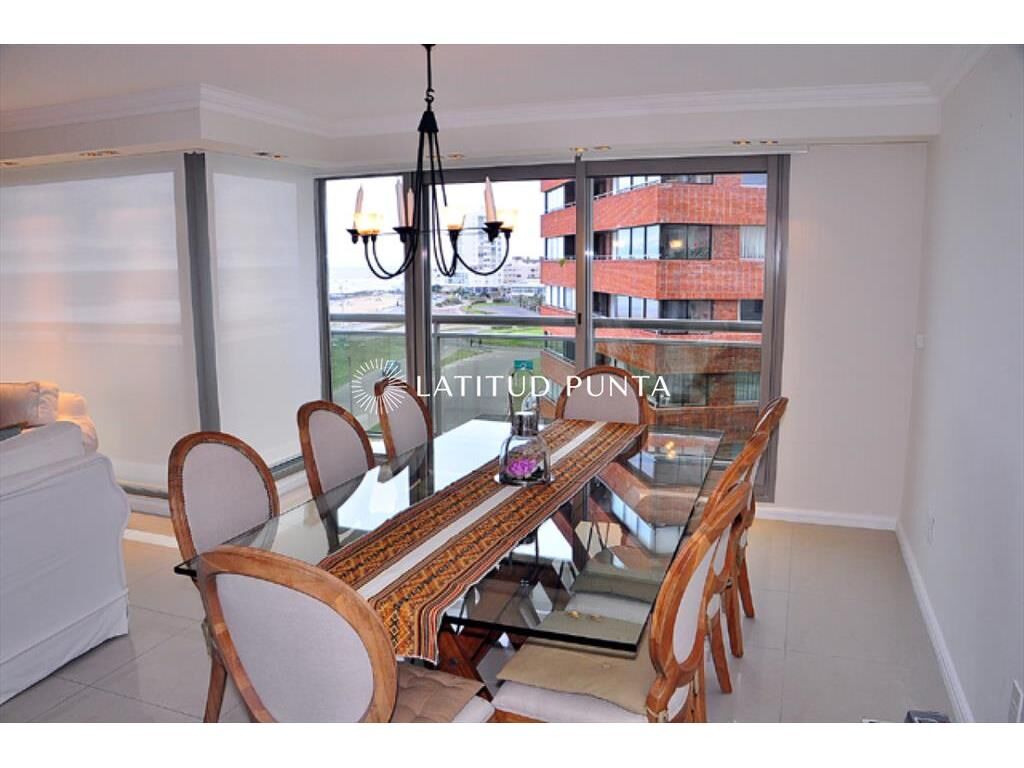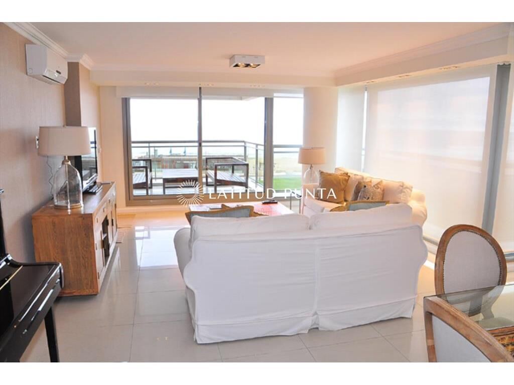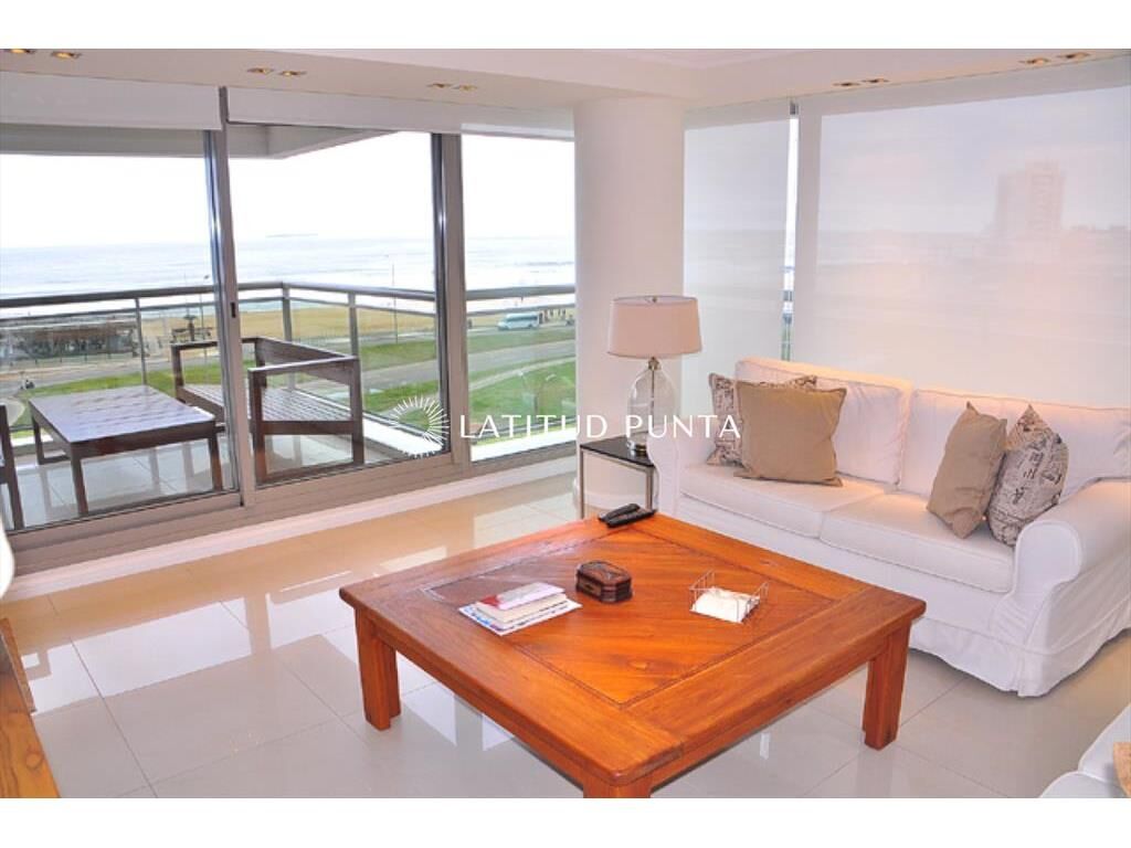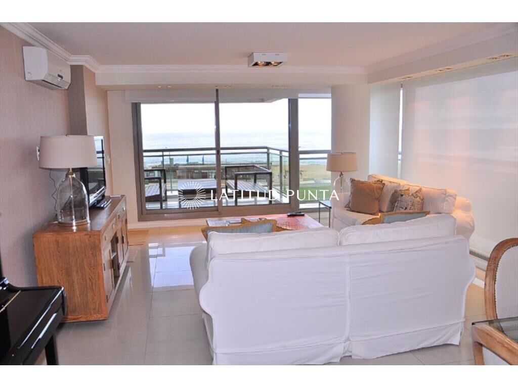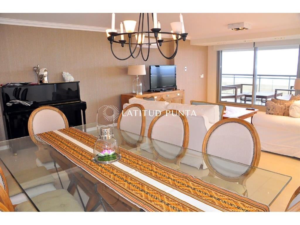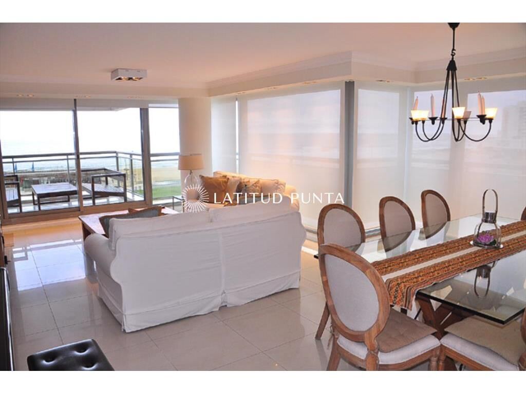 Apartamento en primera fila de playa Brava, esquinero, espectacular vista a Los Dedos y vista parcial a playa Mansa (a 200 metros de distancia), amplias terrazas (frente y fondo). Estado súper impecable, totalmente equipado con muebles de muy buena calidad. A modo de resumen: dormitorio principal en suite y con vestidor más 3 dormitorios en suite, cocina completa y espaciosa, lavadero, living-comedor, toilette, garage doble. Amenities de primera categoría.