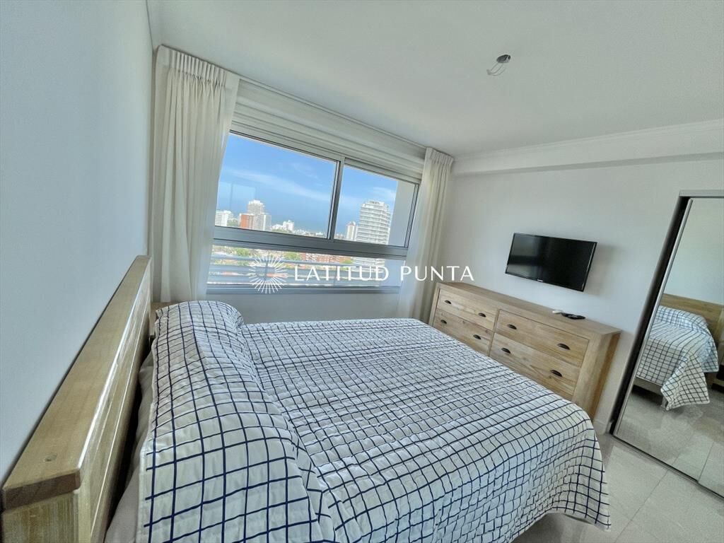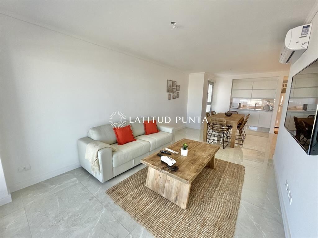 Apartamento en Mansa, Punta del Este, unidad finamente decorada, living comedor con cocina integrada, terraza cerrada con parrillero propio, 2 dormitorio (1 suite), 2 baños. Aire acondicionado en todos los ambientes. Garaje en sub-suelo.