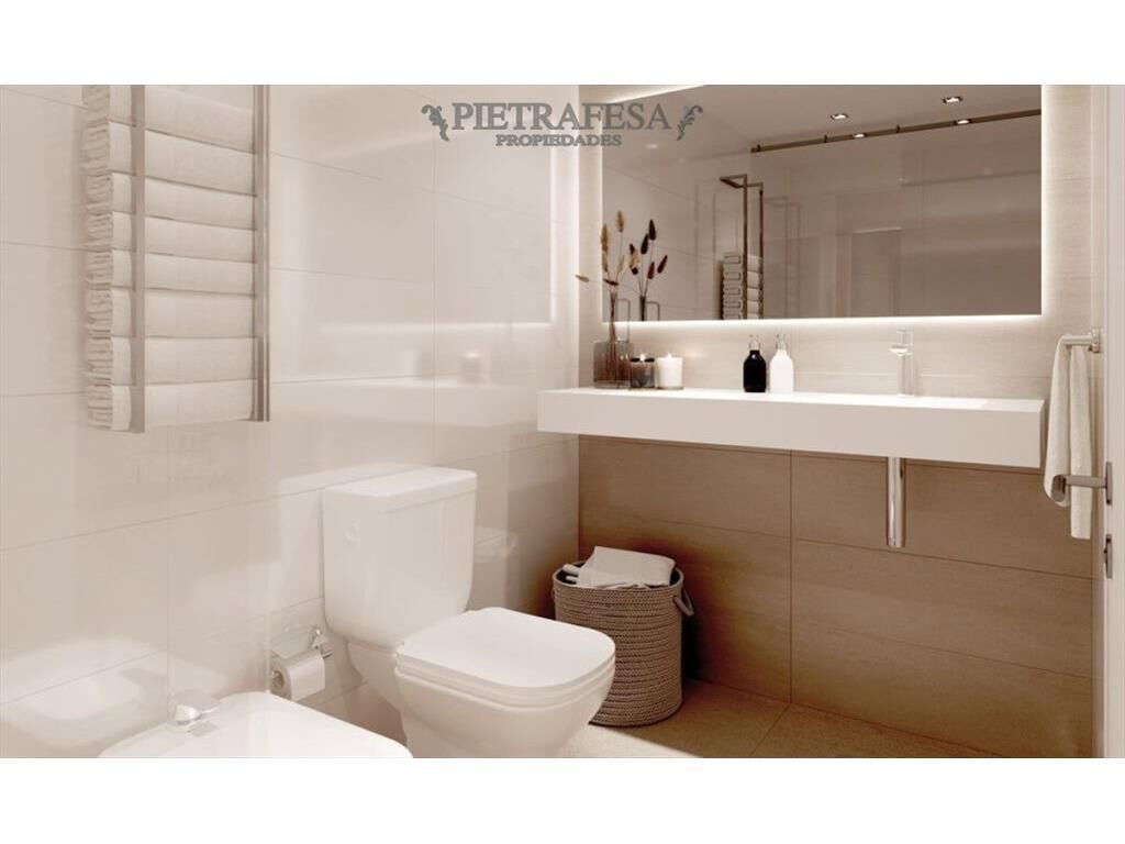 1 baño completo y 1 social con diseño moderno y mesada en superficie sólida acrílica con bacha incorporada, artefactos sanitarios con doble descarga para ahorro de agua.