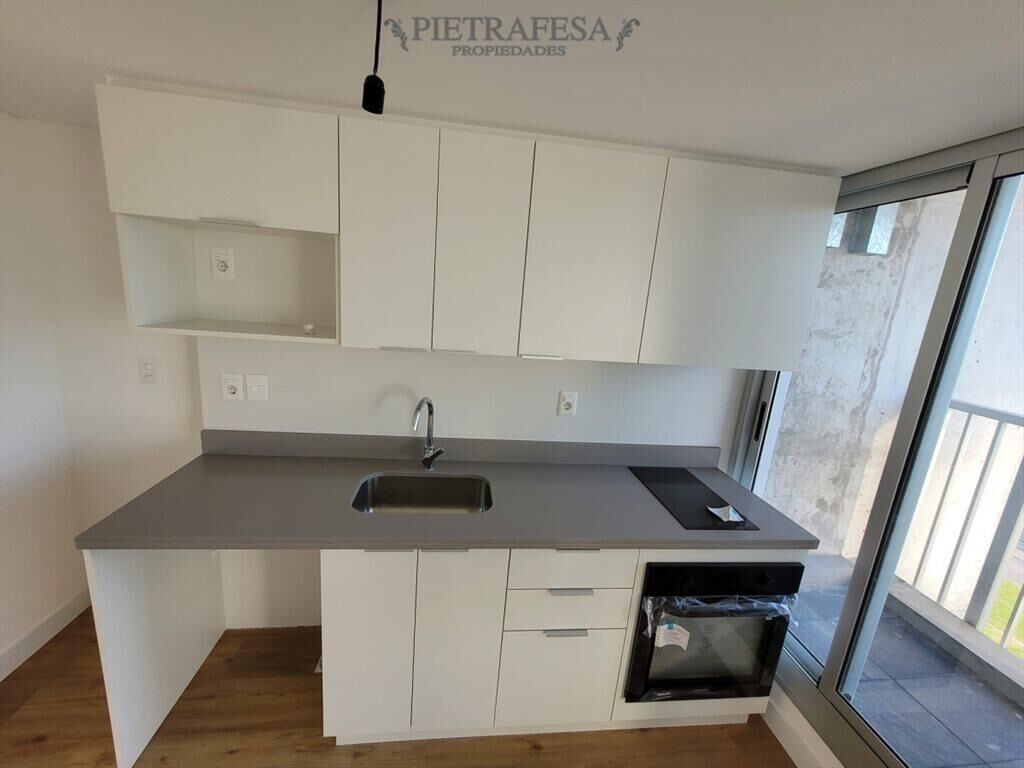 Cocina integrada con barra; placares sobre y bajo mesada; cuenta con anafe, horno empotrado y campana.