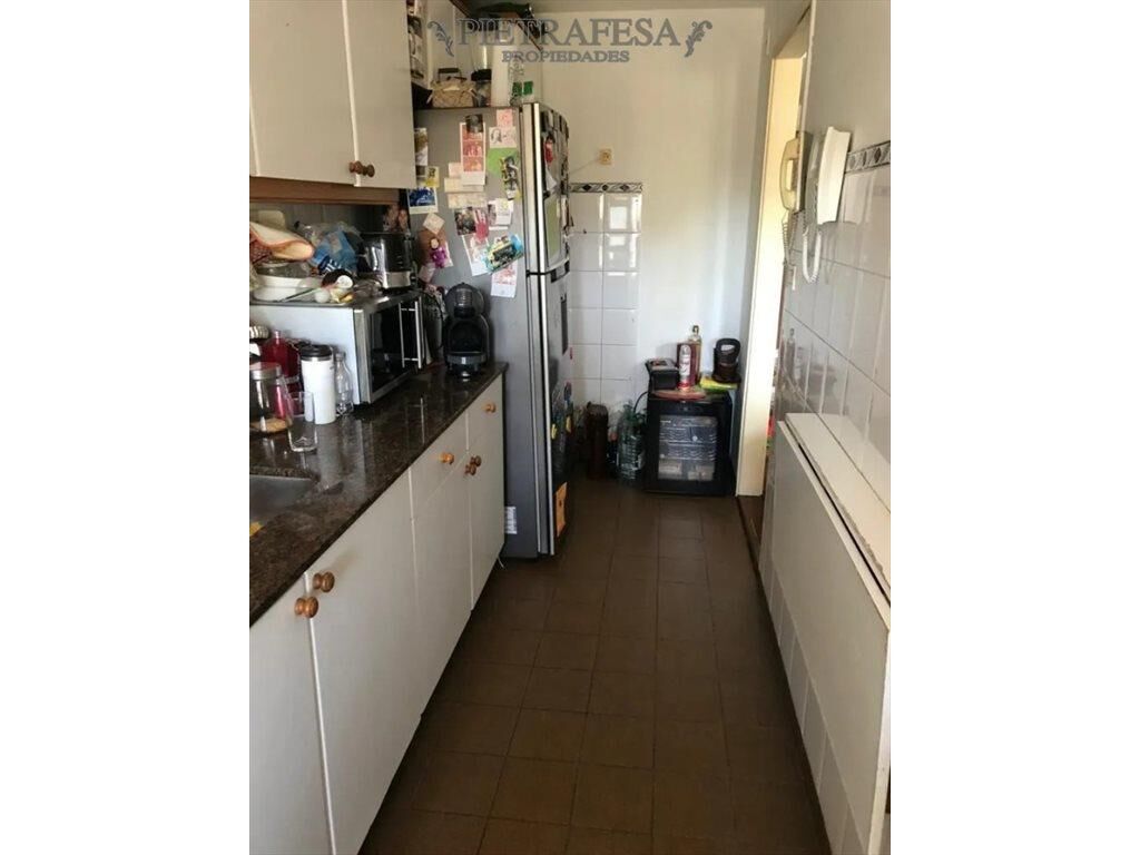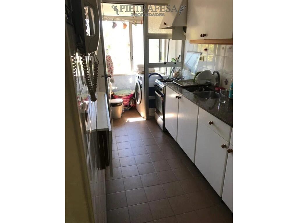 Cocina definida con terraza lavadero, placar sobre y bajo mesada y extractor.