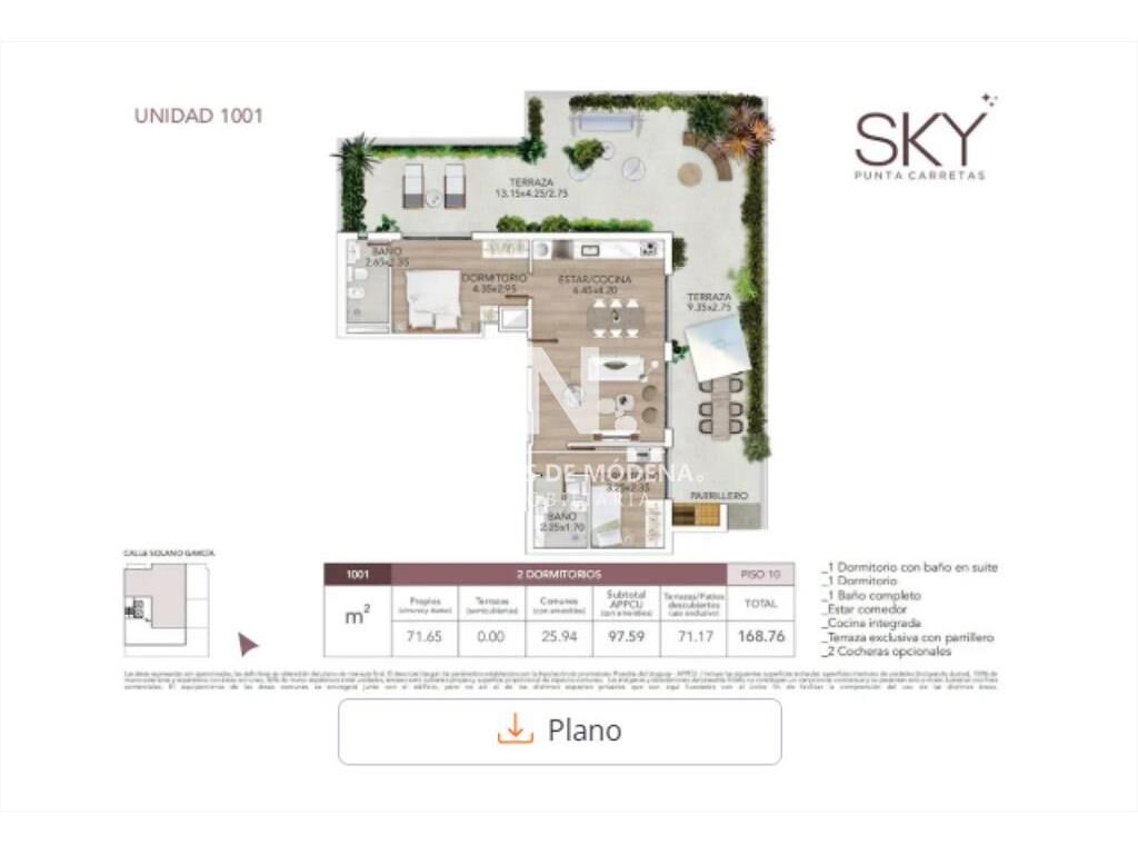 La unidad en venta cuenta con 2 dormitorios, 2 baños (uno en suite) y una amplia terraza exclusiva que amplía las visuales y el disfrute del espacio exterior. Su cocina integrada, living y comedor conforman un ambiente moderno y funcional, ideal para quienes valoran la comodidad y el diseño contemporáneo. Superficie total: 169 m .