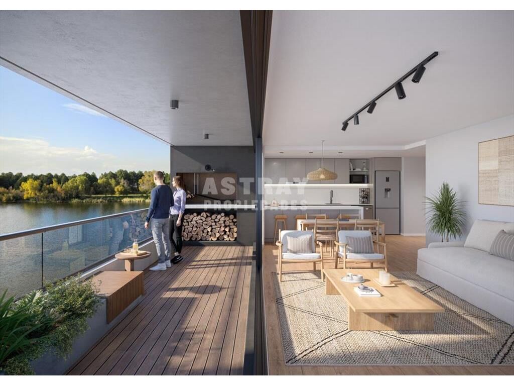 Living comedor con cocina semi integrada y salida a balcón con vista lateral al lago.