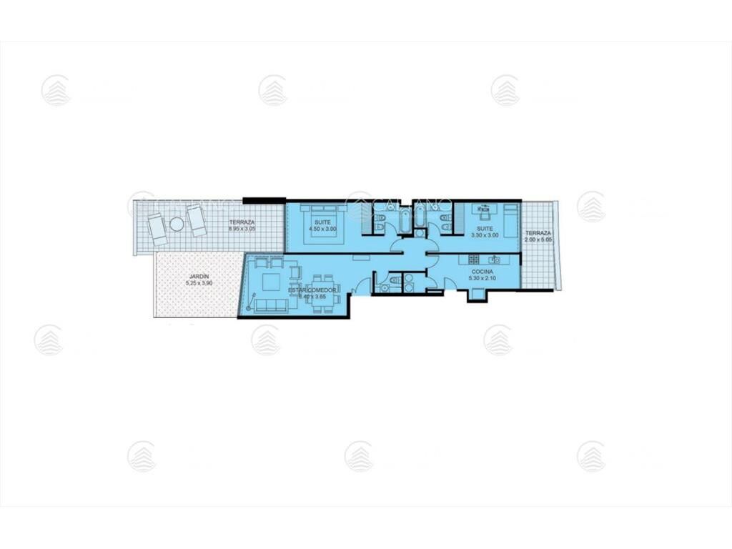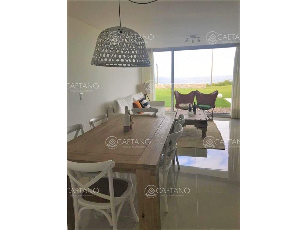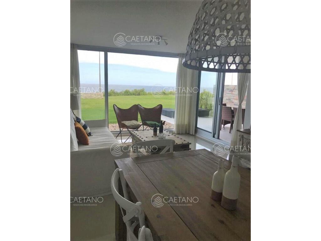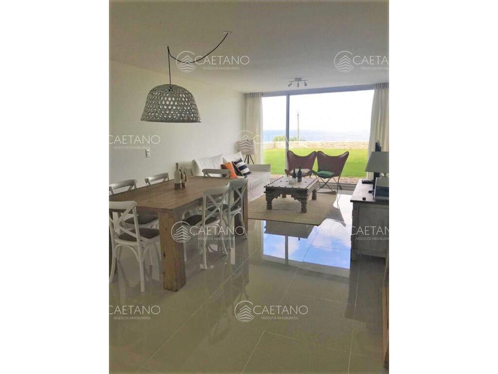 Muy buena planta distribuida en dos cómodos dormitorios en suite, más toilette. Amplio living comedor con grandes ventanales que proporcionan una iluminación natural espectacular con salida a la terraza y jardín de uso exclusivo que se funde con el horizonte marino. Cocina definida, bien equipada.