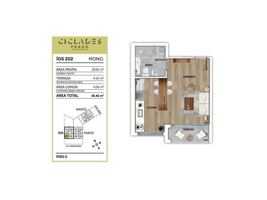 Cíclades Prado es un condominio de tres edificios de planta baja y tres pisos, (ÍOS, PAROS y NAXOS, implantado en un predio que atraviesa la manzana y le abre frente a dos avenidas icónicas del barrio: Av. Agraciada y Av. 19 de Abril.