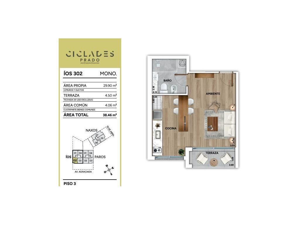 Cíclades Prado es un condominio de tres edificios de planta baja y tres pisos, (ÍOS, PAROS y NAXOS, implantado en un predio que atraviesa la manzana y le abre frente a dos avenidas icónicas del barrio: Av. Agraciada y Av. 19 de Abril.