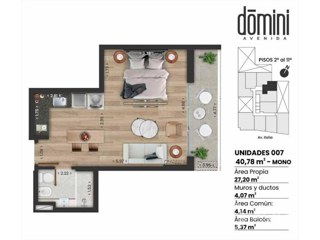 Venta de monoambiente en La Blanqueada El monoambiente cuenta con: -Cocina Integrada -Living Comedor  -Terraza - Anafe vitrocerámico de 2 hornallas. - Campana instalada y previsión para horno eléctrico empotrado. - Cocina con mesada de granito y muebles sobre y bajo mesada. - Preinstalación para lavarropas. - Baño y cocina con grifería mono comando - No incluye placares. - Cerradura digital en la puerta de acceso. - Cortina de enrollar con sistema monoblock. Domini Avenida está ubicado sobre uno de los principales conectores este-oeste de Montevideo, a mitad de camino entre el Centro y Carrasco. Muy cerca de los Shoppings e hipermercados más importantes de la ciudad, como también de los principales centros de salud del país. La cercanía al Parque Batlle completa esta excelente ubicación y equilibra la convivencia urbana con la naturaleza de uno de los grandes pulmones verdes de la ciudad. -109 apartamentos -59 cocheras -Bicicletero -Laundry -Gimnasio -Playroom -2 Barbacoas/Parrillas -2 Terrazas Lounge -Local Comercial Cochera opcional desde U$S 18.000 Comisión inmobiliaria: 3% + IVA Gastos de Ocupación: 4% Fondo de reserva: 0.25% OPCIONES DE PAGO: Durante Obra: 10% reserva, 20% compromiso, 60% durante obra, 10% ocupación Financiamiento con banco: 5% reserva, 5% compromiso, 10% durante obra, 80% ocupación. INMOBILIARIA GOLF Afiliados a Cámara Inmobiliaria Uruguaya