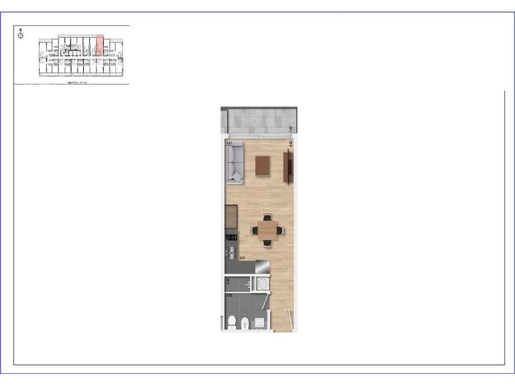 Monoambiente con terraza, cocina integrada con placares, 1 baño.