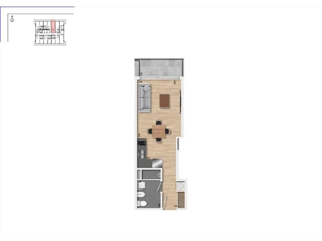 Monoambiente con terraza, cocina integrada con placares, 1 baño.