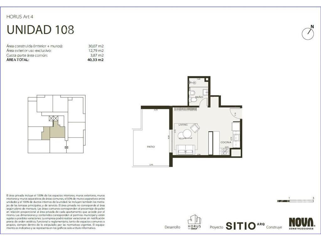 Monoambiente con salida a patio de 13 m2, cocina integrada con placares, 1 baño completo.