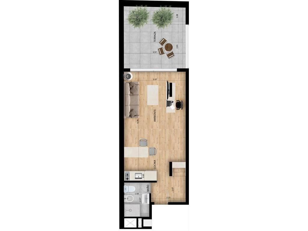 Monoambiente con cocina integrada con placares bajo y sobre mesada, campana, horno y anafe, amplia terraza al frente de 18 m2, 1 baño.