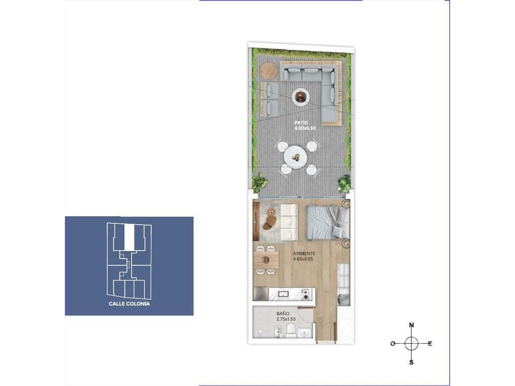 Monoambiente con terraza, cocina integrada con placares, 1 baño, patio de 25 m2.