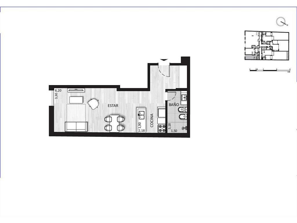 Monoambiente con cocina integrada con placard inferior, 1 baño completo.