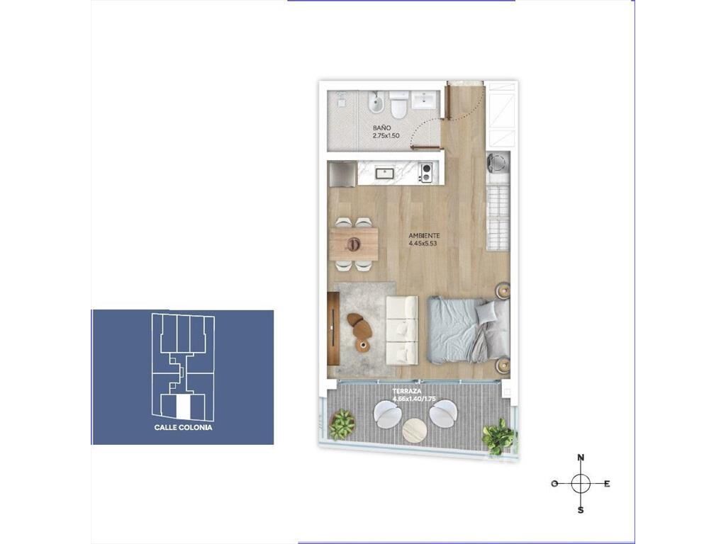 Monoambiente con terraza al frente, cocina integrada con placares, 1 baño.