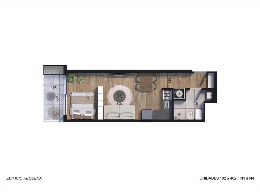 Monoambiente con terraza, cocina integrada con placares, 1 baño.