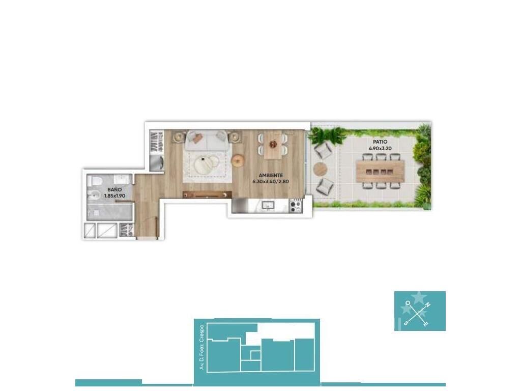 Monoambiente con cocina integrada con placares y extractor, placard para lavarropas, 1 baño con mueble, espejo y extractor. Patio de 16 m2.