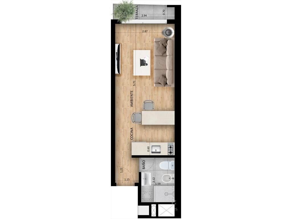 Monoambiente con terraza al frente, cocina integrada con placares bajo y sobre mesada, campana, horno y anafe, 1 baño.