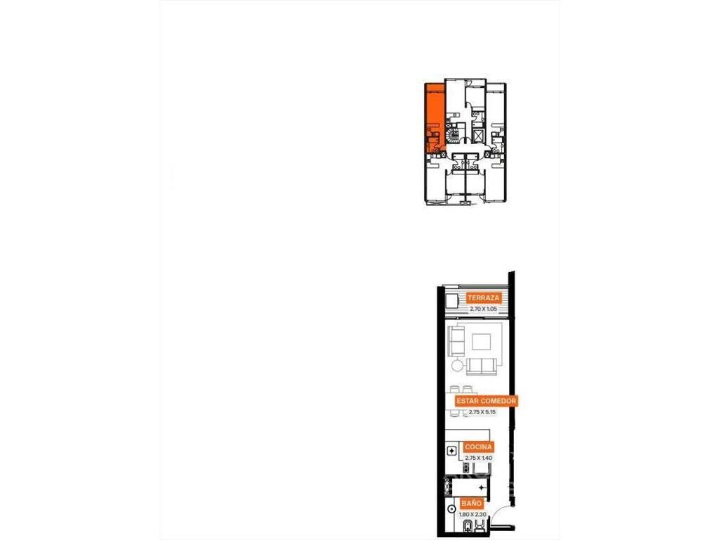 Monoambiente con terraza, cocina integrada con placares, 1 baño completo.