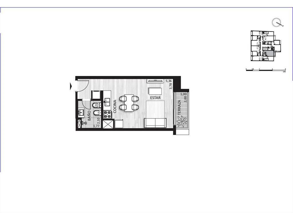 Monoambiente con terraza, cocina integrada con placard inferior, 1 baño completo.