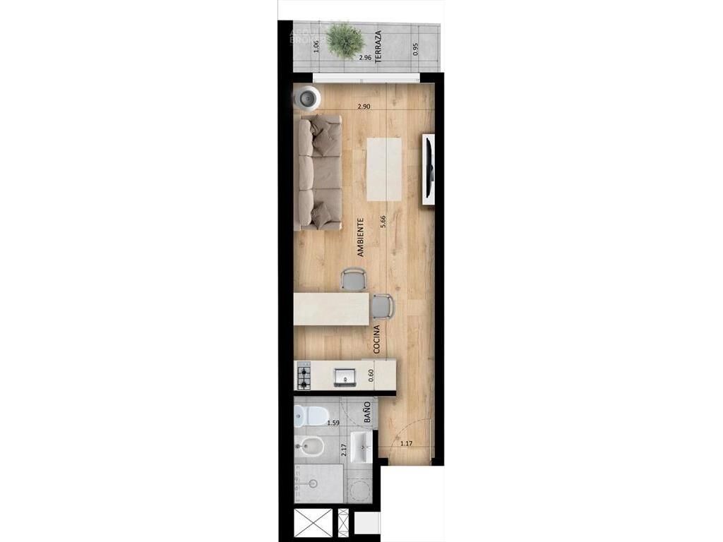 Monoambiente con terraza al frente, cocina integrada con placares bajo y sobre mesada, campana, horno y anafe, 1 baño.