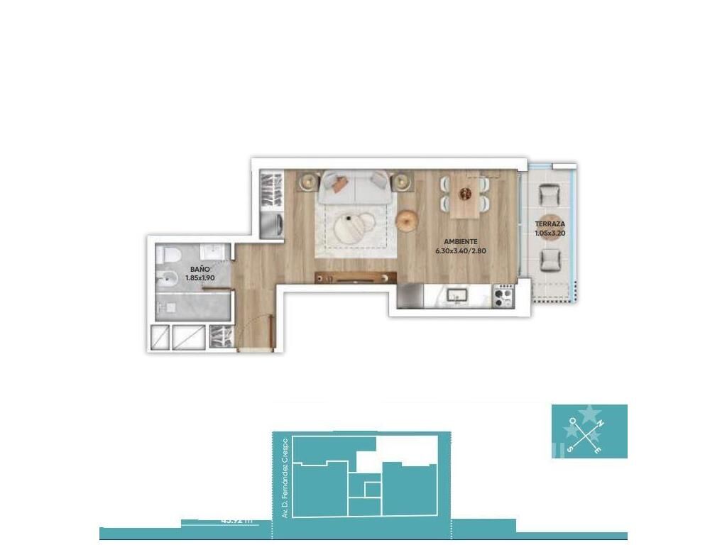 Monoambiente con terraza, cocina integrada con placares y extractor, placard para lavarropas, 1 baño con mueble, espejo y extractor.