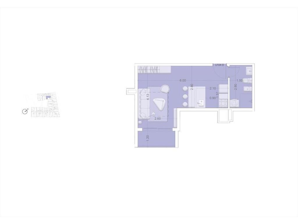 Monoambiente con terraza, cocina integrada con placares, 1 baño.